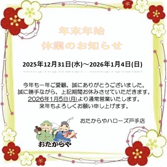 いつもご利用誠にありがとございます🙌 おたからやハローズ戸手店です🕊️🫧 あっとゆう間に年末ですね😳💡 今年も1年当店をご愛顧いただき誠にありがとうございました😊💕 皆様のおかげで今日を迎える事ができ 本当に感謝でいっぱいです😭 良い年末年始をお過ごしいただけますよう、お祈り申し上げます🍀✨ 来年もまた変わらぬご愛顧のほど、よろしくお願い申し上げます🤲🌟